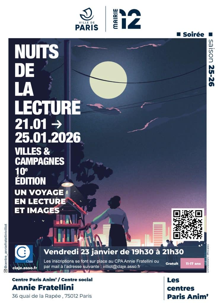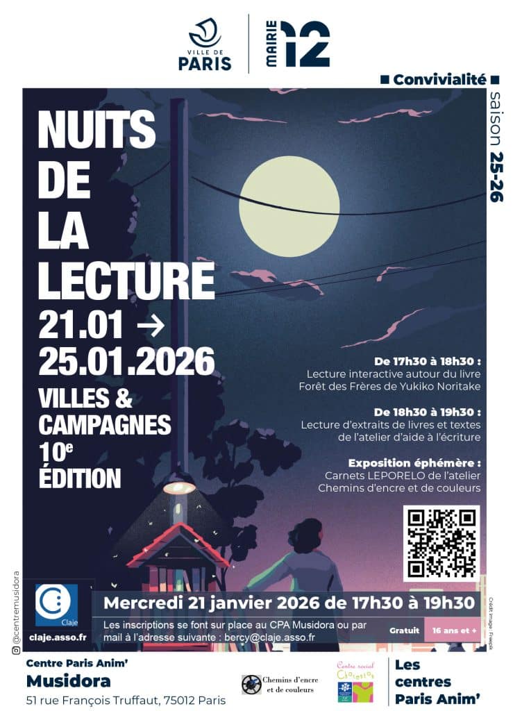 Les 21 et 23 janvier au CPA Musidora et Annie Fratellini venez participer à Les Nuits de la Lecture, une manifestation du ministère de la Culture qui promeut le livre et la lecture auprès de tous les publics.
