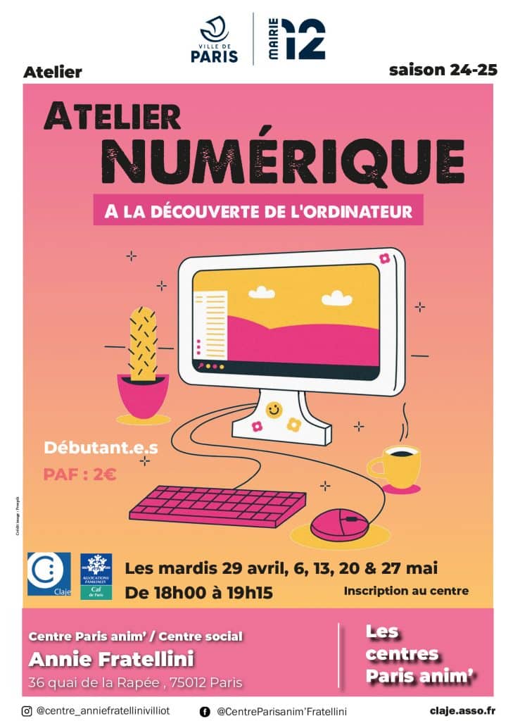 Le centre Paris Anim’ / Centre social Annie Fratellini propose des ateliers numériques pour les débutants et débutantes, tous les mardis au mois de mai.