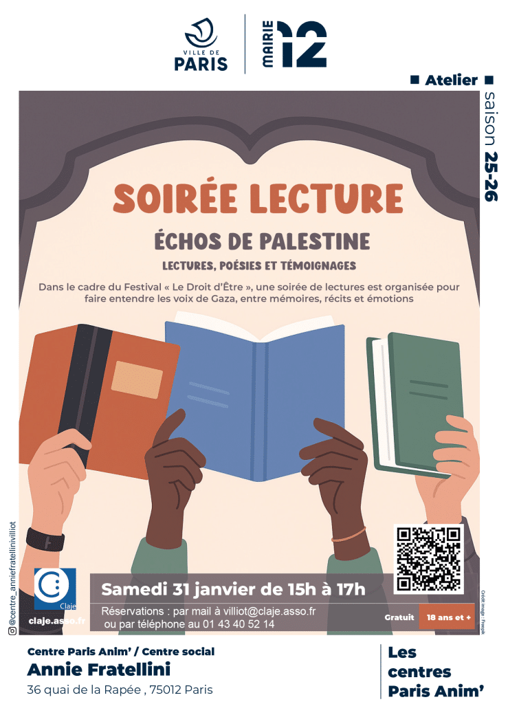 Dans le cadre du Festival « Le Droit d’Être », un atelier de lecture intitulé « Échos de Palestine » est organisée samedi 31 janvier 2026.