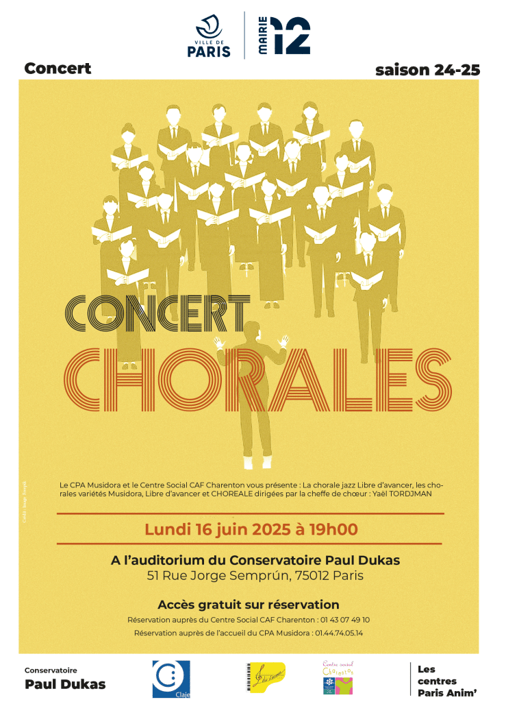 Le CPA Musidora et le Centre Social CAF Charenton vous invitent à un concert exceptionnel à l’auditorium du Conservatoire Paul Dukas le lundi 16 juin 2025.