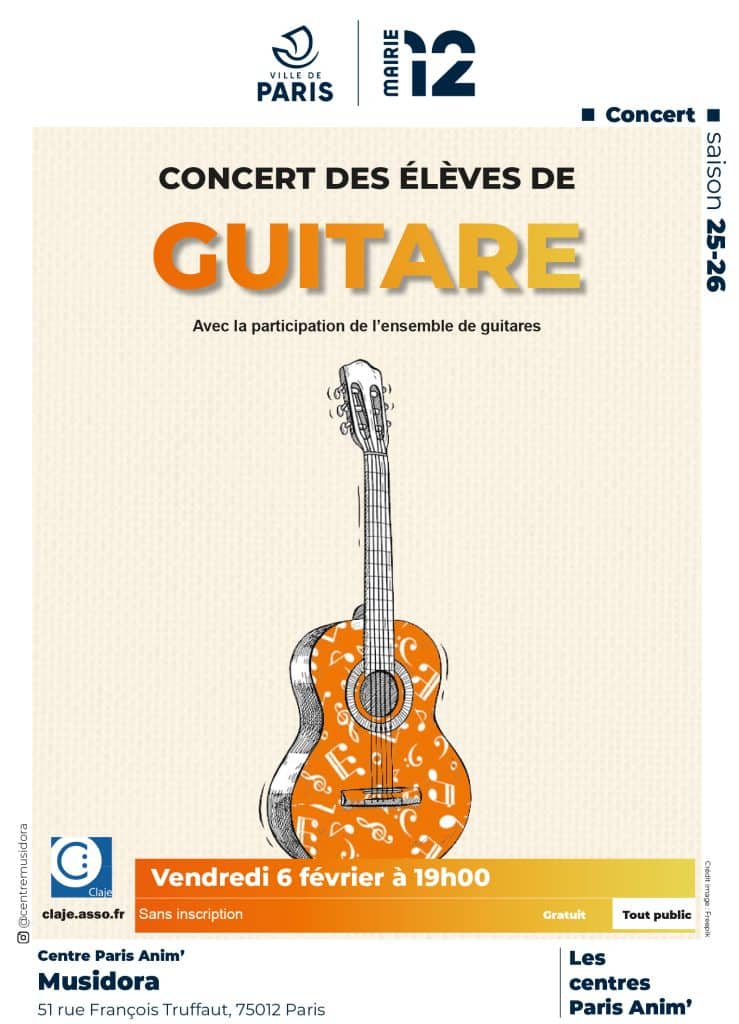 Le vendredi 6 février 2026 à 19h00, le CPA Musidora accueille le concert des élèves de guitare avec la participation de l’ensemble de guitares.