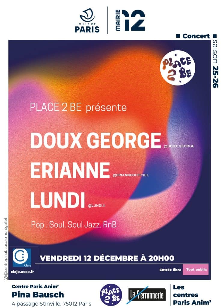 Le vendredi 12 décembre 2025 à 20h00, le CPA Pina Bausch accueille le concert Place 2 Be , dans le cadre du dispositif d’accompagnement des centres Paris Anim’.