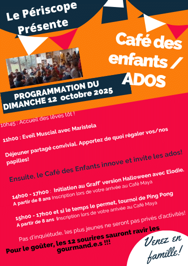4 dimanches par an, le Périscope investit le café Maya Angelou pour développer des activités à destination des familles : ateliers manuels, éveil musical, jeux, spectacles, etc.