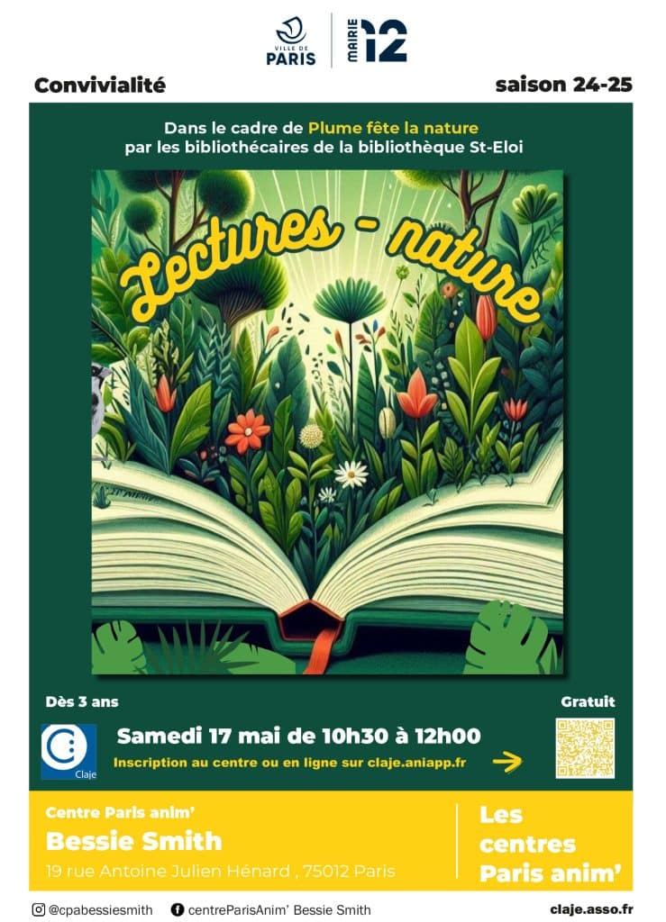 Rendez-vous le samedi 17 mai au CPA Bessie Smith pour un moment convivial autour de la nature avec « Lectures-Nature », en partenariat avec la bibliothèque Saint-Éloi.