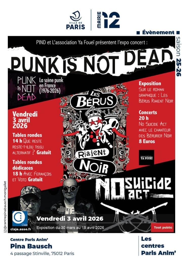 En écho au vernissage de l’expo grand format « LES BERUS RIAIENT NOIR », qui raconte dans un style unique, la folle histoire du groupe Bérurier Noir, « NO SUICIDE ACT donnera un concert pour prolonger l’Energie ! « No Suicide Act » est un duo formé par FanXoa (alias Fanfan ex chanteur de Bérurier Noir ) et Madsaxx (saxo de uKanDanZ).