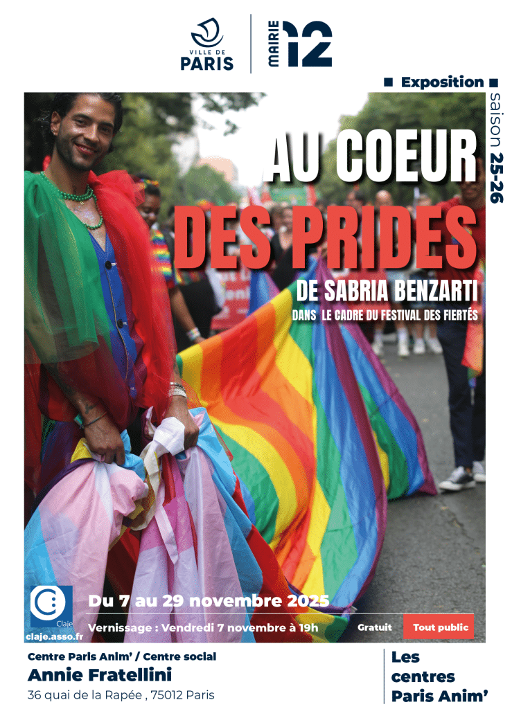 Dans le cadre du Festival des Fiertés l’exposition « Au coeur des prides » de Sabria Benzarti se tiendra au CPA Annie Fratellini du 7 au 29 novembre 2025, avec un vernissage prévu le vendredi 7 novembre à 19h.