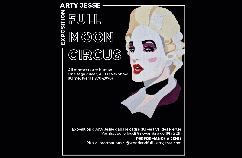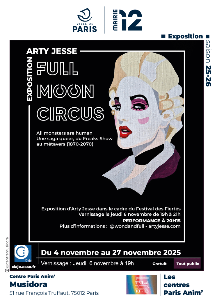 Dans le cadre du Festival des Fiertés l’exposition « Full moon circus » d’Arty Jesse se tiendra au CPA Musidora du 3 au 29 novembre 2025, avec un vernissage prévu le jeudi 6 novembre à 19h.