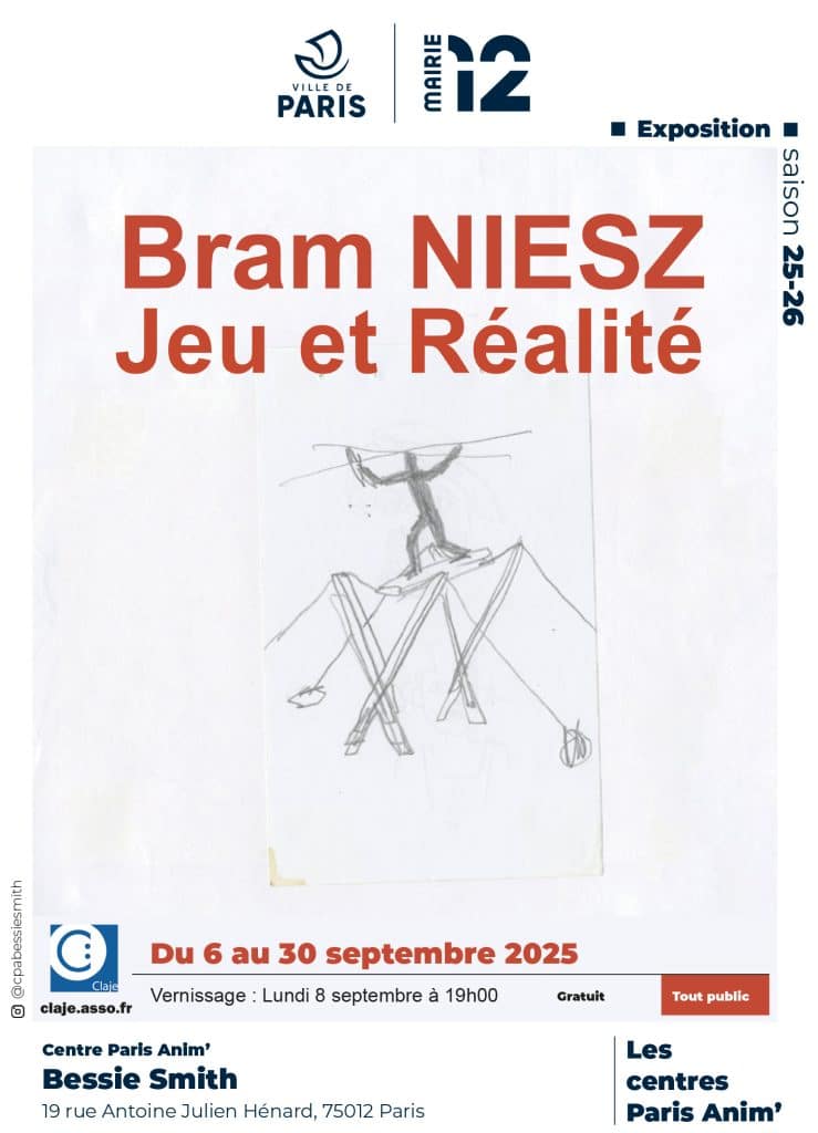 L’exposition Jeu et Réalité de l’artiste Bram NIESZ se tiendra du lundi 8 au 30 septembre 2025 au CPA Bessie Smith, avec un vernissage le lundi 8 septembre à 19h.