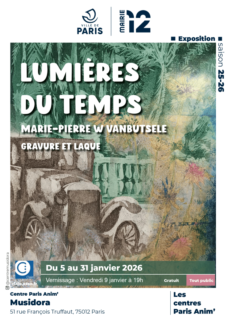 L’exposition « Lumières du temps » de Marie-Pierre W Vanbutsele se tiendra au CPA Musidora du 5 au 31 janvier 2026.
