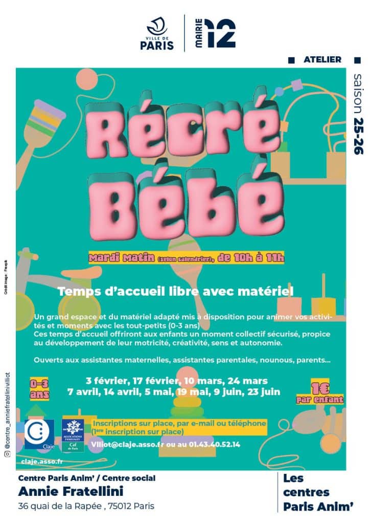 Temps d’accueil libre avec matériel pour les tout petits, deux mardis par mois au centre Paris Anim’ Fratellini.