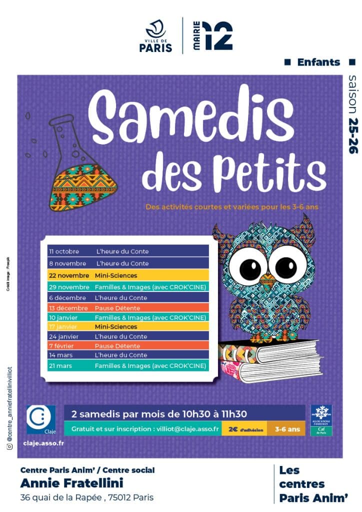 Lecture de contes, ateliers autour de l’image, ou expériences scientifiques , les samedis matins sont ouverts aux enfants et leurs parents pour un moment de partage et de convivialité en famille.