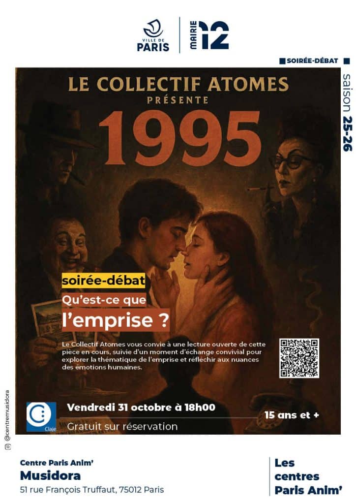 Le Collectif Atomes vous convie à une lecture ouverte de cette pièce en cours, suivie d’un moment d’échange convivial pour explorer la thématique de l’emprise et réfléchir aux nuances des émotions humaines.