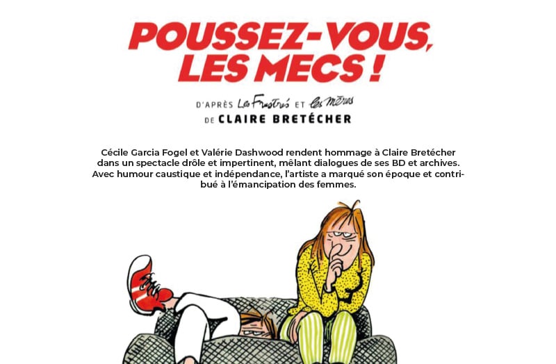 Cécile Garcia Fogel a conçu, à partir des textes de Bretécher, des dialogues de ses BD, d’interviews de l’INA, un spectacle aussi irrévérencieux qu’impertinent qui repose sur un montage sans accroc. Avec Valérie Dashwood, elles forment un sacré duo, complice, drôle. On sent qu’elles prennent un plaisir fou à se glisser dans la peau de ces personnages à la fois ridicules et attachants. Claire Bretécher, « bande-dessinateur » ça, c’était autrefois, quand le masculin l’emportait sur le féminin. Bretécher préférait en rire. Faut dire qu’elle avait le coup de crayon caustique et un brin vachard, ne se privant pas de se moquer de ses contemporains avec un sens de l’autodérision salutaire. Indépendante jusqu’au bout de son crayon, Claire Bretécher ne se revendiquera d’aucun mouvement féministe. Mais ses dessins ont contribué à l’émancipation des femmes. Alors oui, Poussez-vous les mecs ! Il était temps, non ?