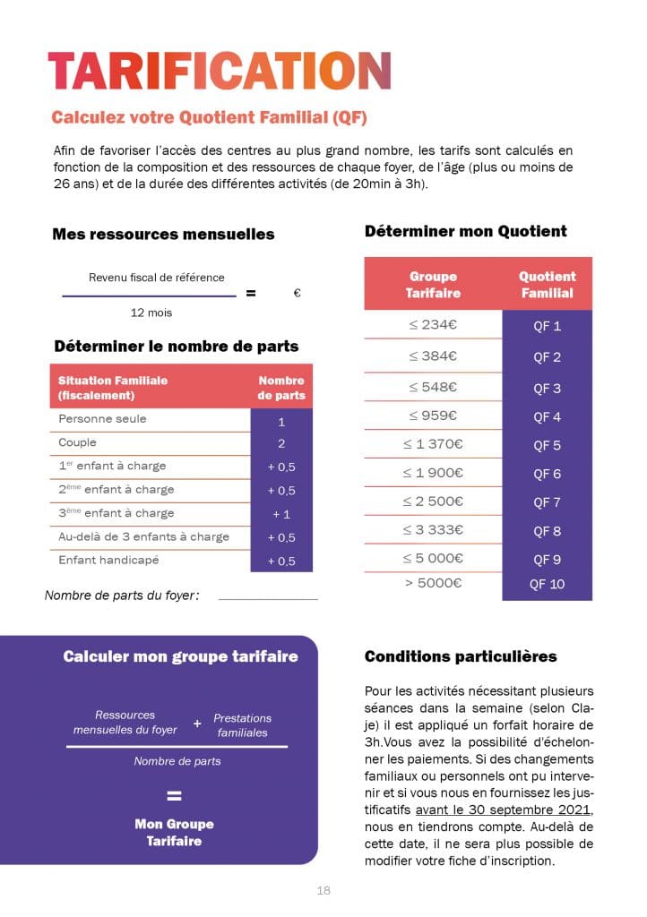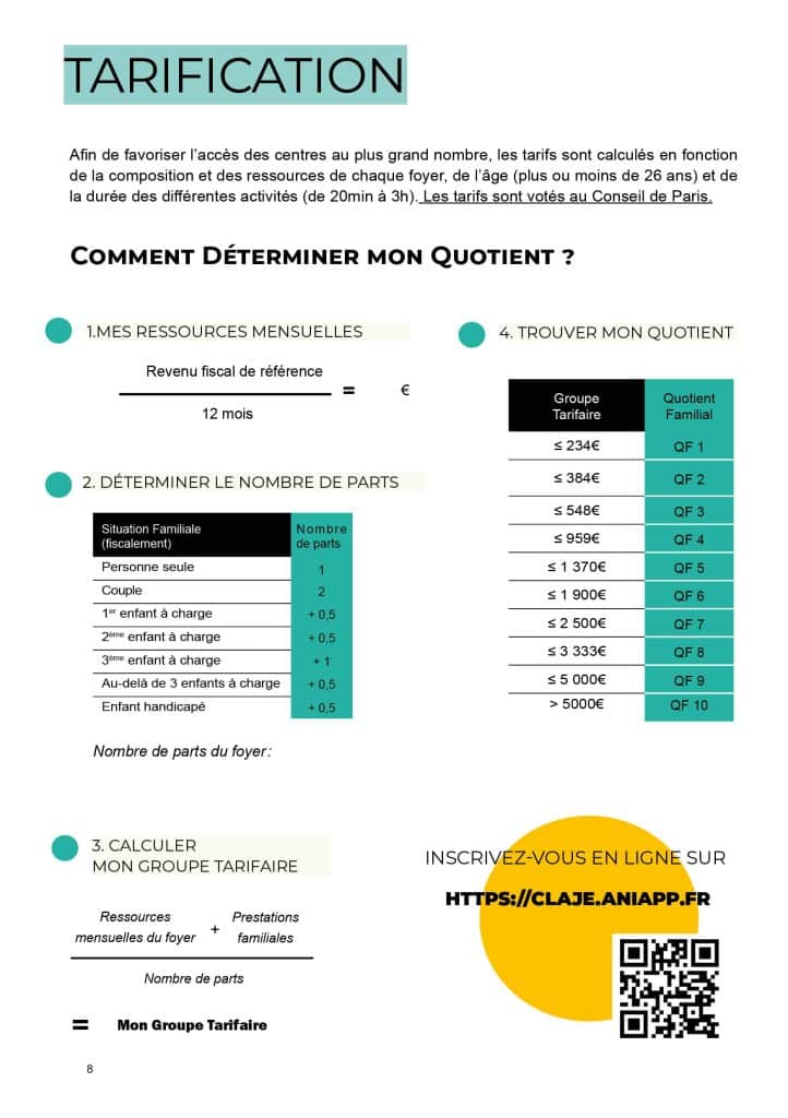 Afin de favoriser l’accès des centres au plus grand nombre, les tarifs sont calculés en fonction de la composition et des ressources de chaque foyer, de l’âge (plus ou moins de 26 ans) et de la durée des différentes activités (de 20min à 3heures) et fixés chaque saison par la Ville de Paris.